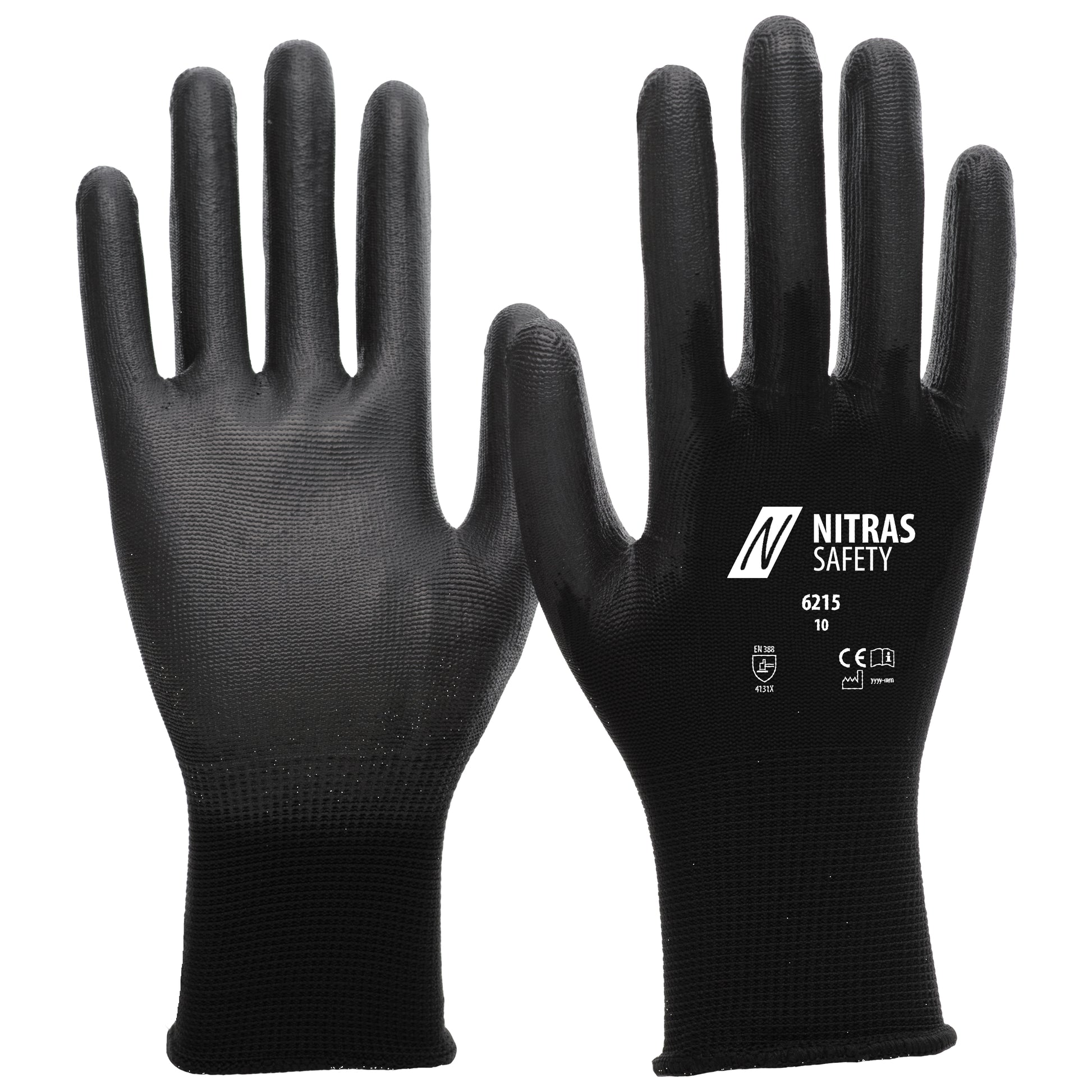 Gants NITRAS en nylon noir, enduits PU, noirs (code couleur : 1000), partiellement enduits sur la paume et le bout des doigts, poignet tricoté, particulièrement sensibles, parfaits pour la manipulation de petites pièces, excellente sensibilité tactile, catégorie de risque EPI II